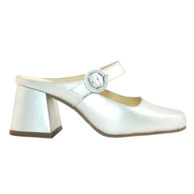 Mule com fivela encapada no couro legítimo na cor metalizada Prata